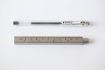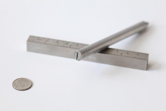This thing is really beautiful. It’s milled from a single block of stainless steel, and the minimalist barrel fits into a square sheath (that has a ruler on the side!) so well, it almost has a pneumatic sliding effect.