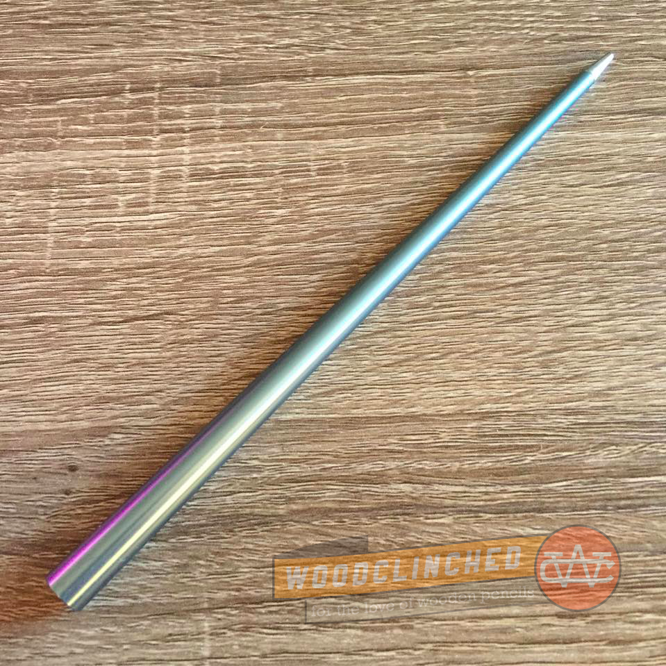 The Prima itself comes in aluminum, anodized in seven colors — mine is “Airforce Blue”. It’s just over seven inches long — slightly shorter than an unsharpened Palomino Blackwing — but also much thinner at the writing end than a typical pencil. It’s perhaps too thin to effectively hold and write with. If I could hold it at the opposite end, it would be perfect.